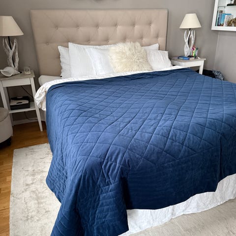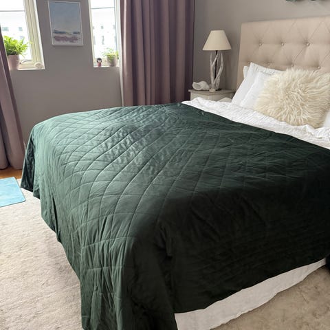 Fint stort överkast från Hemtex i mörkgrönt tyg i sammet. Mått ca 260x260 cm.