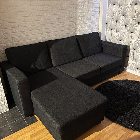 Hörnbäddsoffa från Jysk, Marslev med bra förvaring under schäslongerna. Soffan är i gott skick. För bättre komfort har kuddar och sitsar fyllts upp med mer fyllning vilket gjort den skönare att sitta i. Lätt att hålla ren och torka av. Bäddmadrassen och madrasskydd medföljer köpet och är fläckfria. Djur-och rökfritt hem.