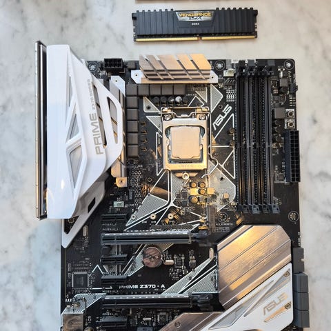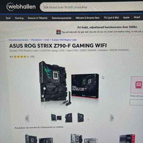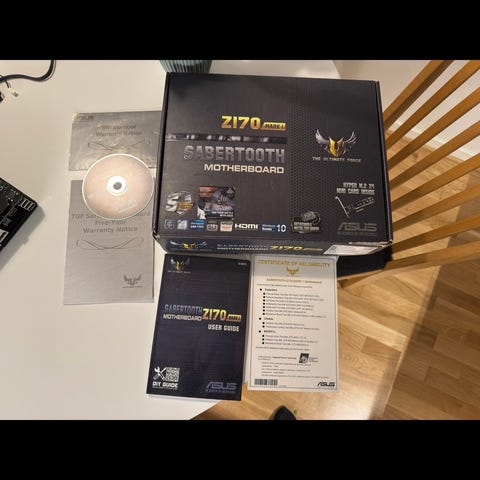 Moderkort Asus ROG med Intel 7700k CPU. Två NVME2 platser och gott om anslutningar för USB och annat.