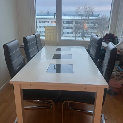 IKEA matbord med sex tillhörande stolar. Bordet är vitt med svarta inslag i bordsskivan. Stolarna är svarta med vad som verkar vara läderliknande material. Passar för matrum eller kök.