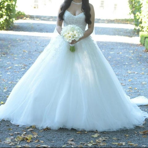 Endast uppsydd några centimeter efter min längd, är 166 cm och hade 6 cm klack. Slöjan finns också till salu.