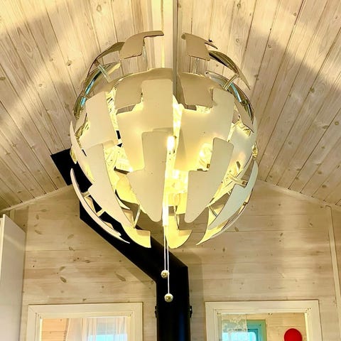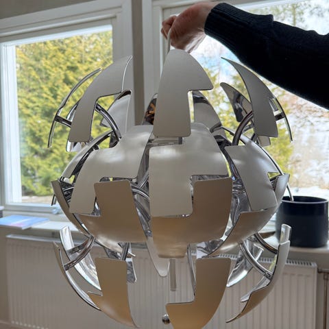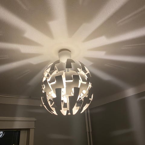 IKEA PS 2014 taklampa i svart färg. Designad av Philippe Starck. Lampan har en unik form som kan ändras från en sluten sfär till en öppen struktur, vilket ger olika ljuseffekter. Passar för takmontering och är tillverkad av plastmaterial.