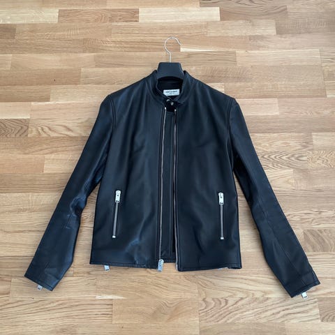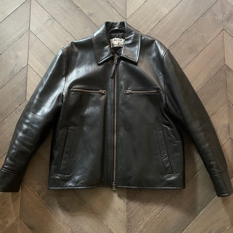 Svart Anine Bing skinn jacka (Lydia leather heter modellen) har en rund halsringning och guldknappar. Jackan har fyra fickor fram. Oanvänd då jag inte tyckte den passade mig. Nypris cirka 16.000 kr.