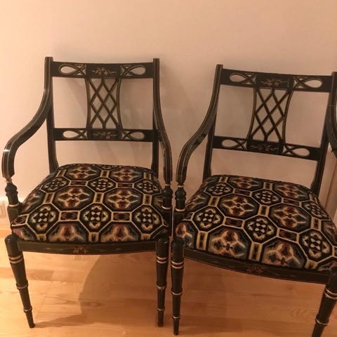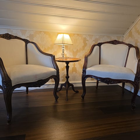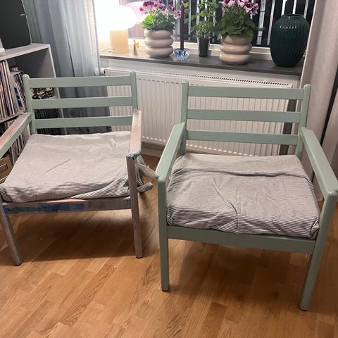 Två stycken karmfåtöljer, sparsamt använda. Avtagbart tyg i sittdynan. 795kr för båda.