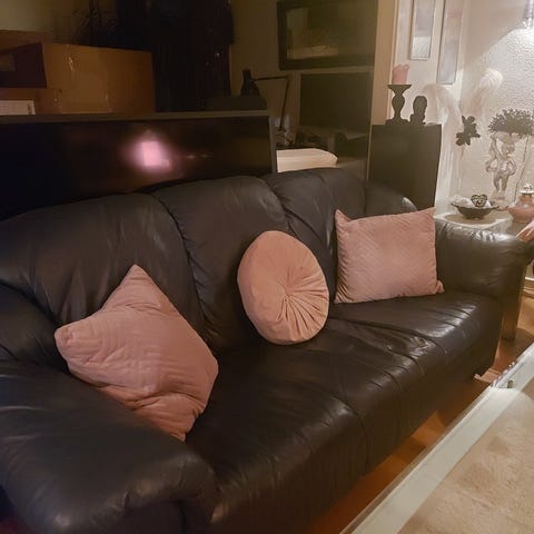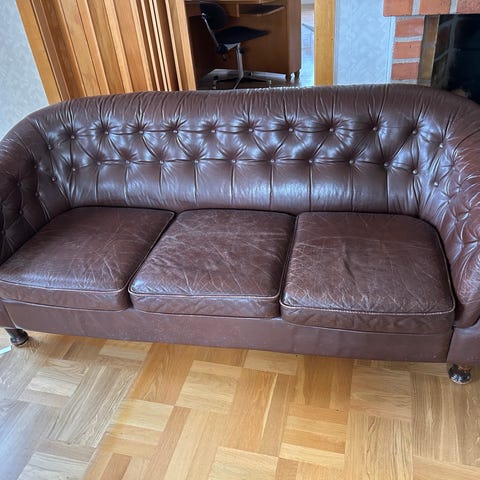 3-sits soffa och 2 fåtöljer bortskänkes mot snabb avhämtning. Mycket sköna att sitta i. Äkta skinn.
