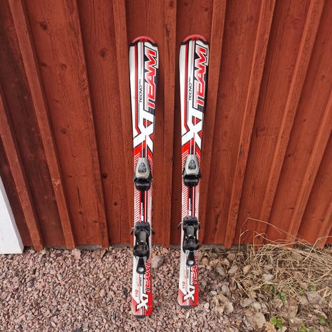 Atomic Redster skidor i röd färg. Skidorna är designade för alpint bruk och är utrustade med bindningar för säker montering av pjäxor. Längd 176 pjäxor storlek 43