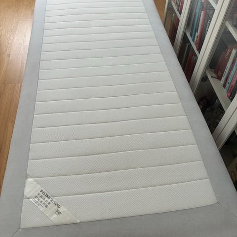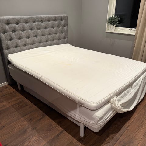 IKEA sängram i vit metall skänkes Sängramen har en klassisk design med runda detaljer på sänggaveln och fotändan. Passar som stomme för madrass och bäddmadrass.