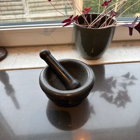 Design House Stockholm mortel tillverkad i svart sten. Används för att mortla kryddor och örter i köket. Robust och hållbar design.