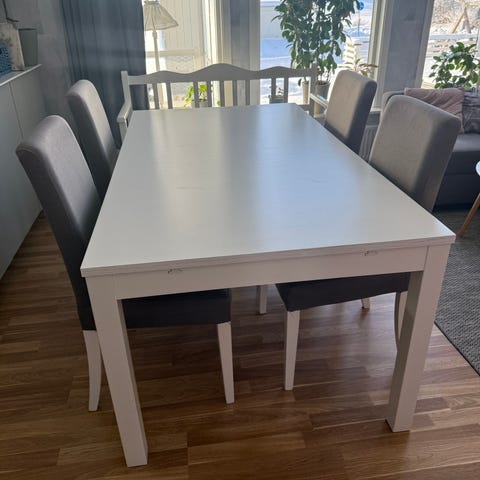Fin köks grupp i massiv ek. Bord 100cm x 180cm. Iläggsskiva 50cm. Stols sitsarna klädda i brunt. Köpt på Möbel tjänst. Tel 076-8349435 Christer.