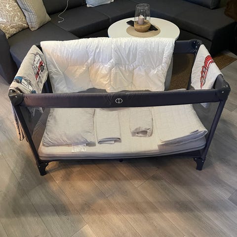 Resesäng för barn i färgglatt utförande med nätväggar för ventilation och sikt. Sängen är hopfällbar och levereras med en röd förvaringsväska för enkel transport och förvaring.