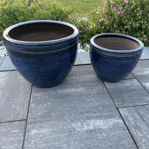 Kruka i keramik i olika storlekar och färger inklusive blå, terrakotta och svart. Passar för inomhus- och utomhusbruk för planteringar.
