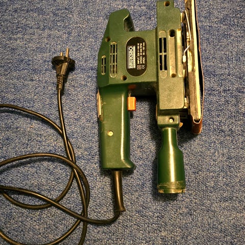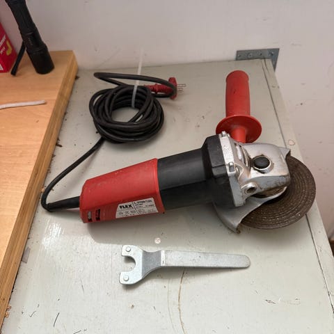 Slipmaskin för beton eller puts. Fungerar kanon. 1500 Watt. Bara använd för två väggor. Med reservskär.