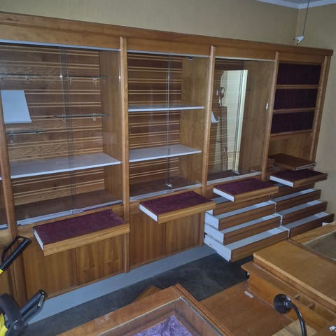 Vintage disk av trä med glasöverdel, utrustad med flera förvaringslådor och hyllor. Disken har en kombination av rött och grönt färgtema och är anpassad för butik eller liknande användning där varor kan visas och förvaras bakom glas.