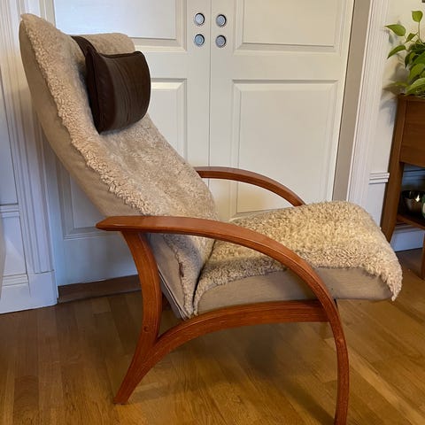 Äkta fårskinn med Mocka tyg . Sliten på vissa ställen , men kan kläs om . 4500:- eller bättre bud .