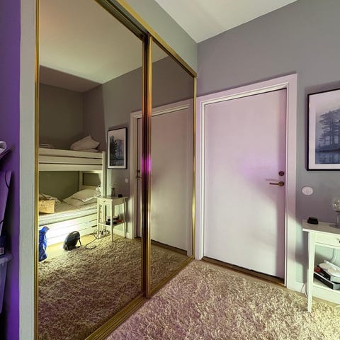 2 skjutdörrar, varav en spegelfront. Inga tillbehör (garderober, reling, etc) följer med.