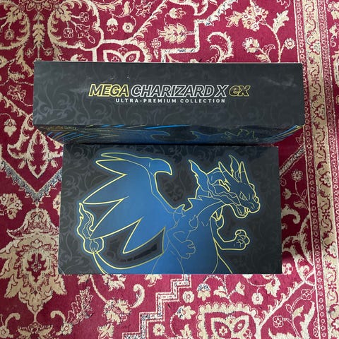 BUDA 🤝 En öppnad Mega Charizard X ex UPC med några tillbehör.