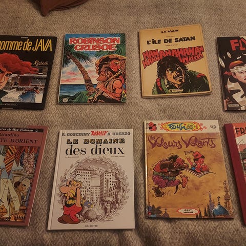 Serietidningar /seriealbum till salu, inköpta i Frankrike och Belgien mellan 1970- och 1990-talen, för barn och vuxna. De förvaras för närvarande i 6-7 flyttkartonger. Vi föredrar att sälja dem så att andra läsare, unga som gamla, fransktalande eller frankofila, kan njuta av en trevlig tillflyktsort medan de läser dessa historiska, fantasy-, science fiction- och andra serier. Intresserad? Kontakta oss så skickar vi dig en lista över våra serier.