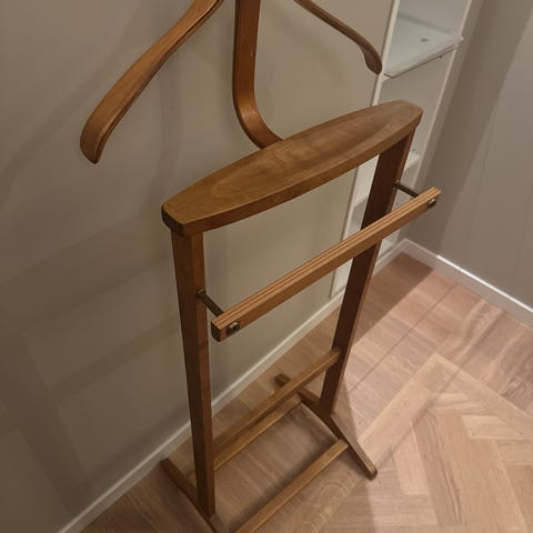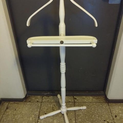 Herrbetjänt modern och fin i vit metall. Perfekt för att hänga kavajer, skjortor och byxor, vilket hjälper till att hålla kläderna skrynkelfria och organiserade.