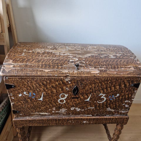 Antik Kista tillverkad i metall och trä, tidigt 1900-tal. Bruksskick.