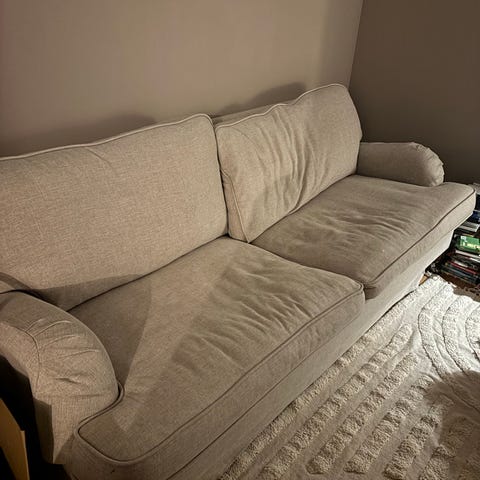 Bäddsoffa i Howardstil med grått tyg. Soffan har en tvåsitsdesign med lösa kuddar. Observera att det finns mindre fläckar på tyget.