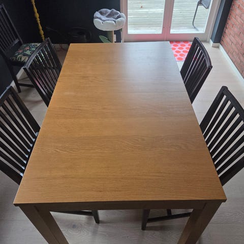 Rejält IKEA matbord i trä med 5 stolar. 2 st iläggs skivor (42cm st) gör att bordet kan göras stort vid behov.