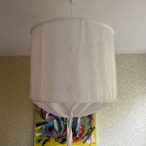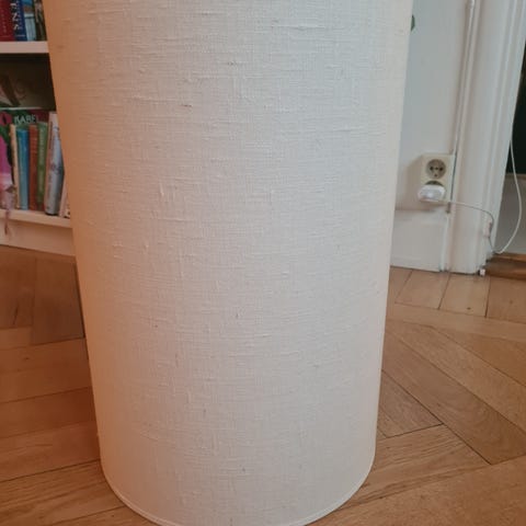 Dalslight lampskärm white från svenska Himla har en stomme tillverkad av vitlackerad metall som täckts av ett linnetyg. Forma lampskärmen med hjälp av bomullsbandet till en stram cylinder eller välj att ha en rundare botten.