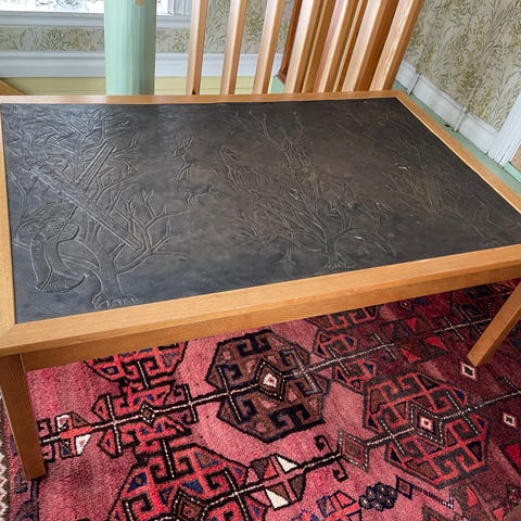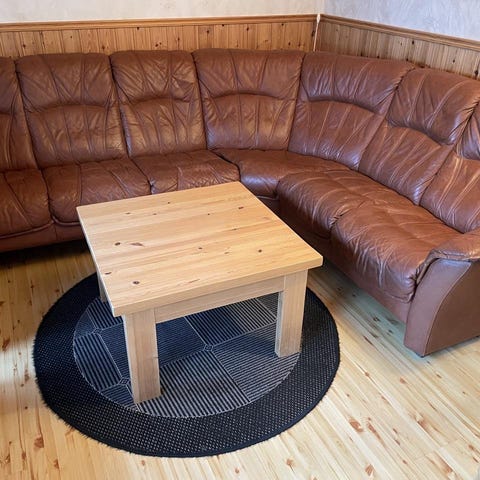 Stort soffbord med dekorplast på skivan under duken, är en pall som ben stativ nu ,måste bort snarast nu. Swich betalning