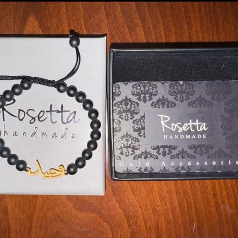 Ett elegant armband med svarta onyx pärlor. Armbandet har en detalj i mitten med guld och silverfärgade accenter.