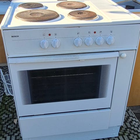 Elektro Helios med tre plattor och ugn. Spisen är av äldre modell 50/60-tal, med vred för inställning av värme. Anslutning sker via 380V, 5400W.