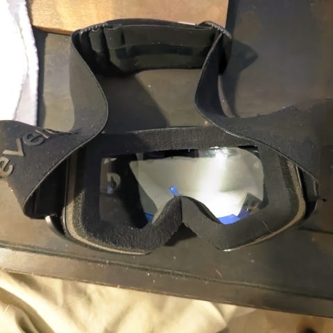 Carrera skidglasögon med transparent ram och svart justerbart band. Glasögonen är designade för att skydda ögonen vid skidåkning och andra vintersporter.