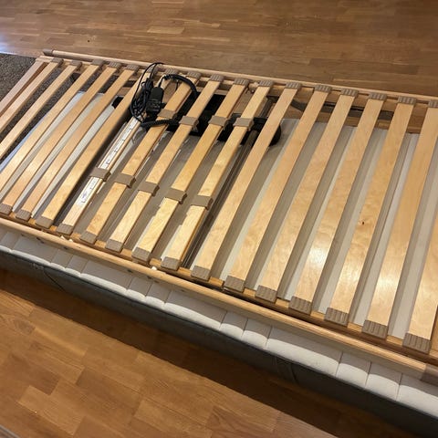 Säljer en Jysk sängram i svart tyg med trästomme och ribbotten. Madrassen tillkommer.