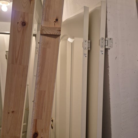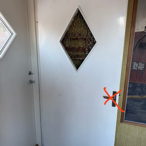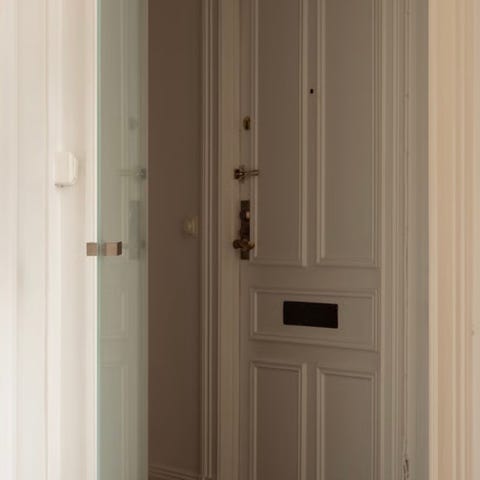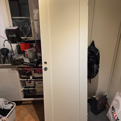 Dörr med glasruta.Dörren är vitmålad och har ett handtags