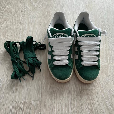 Säljer ett par gröna adidas sneakers i modell Campus 00s då storleken inte passar, de är unisex och passar vem som helst. Skorna är avsedd för vardagligt bruk och har bara använts ett fåtal gånger. De köptes nya för 1200kr för mindre än ett år sedan. Två extra skosnören och skolåda ingår.