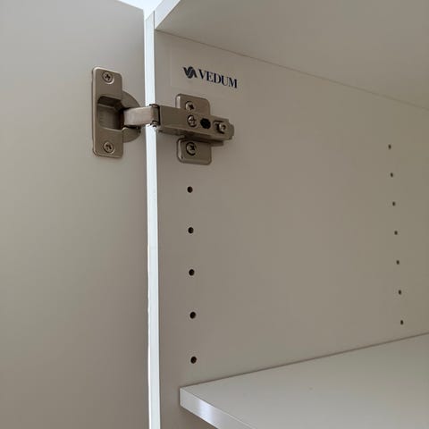 Vi har själva satt in två egna hyllor då denna modell inte fanns kvar i sortimentet när vi ville fylla på med hyllor. Dessa hyllor går inte hela vägen in men fungerar utmärkt. Se bild.