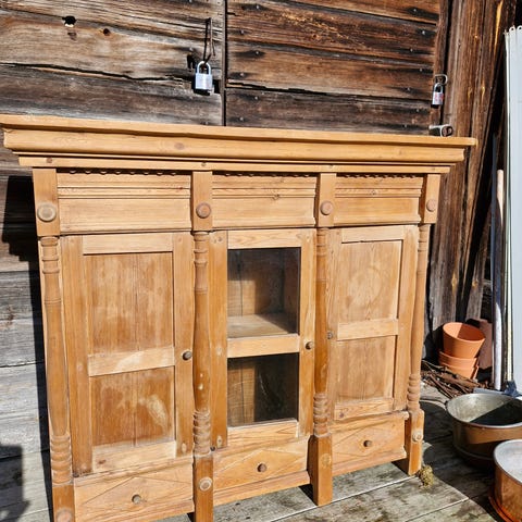Skåp från byskola utanför Sundsvall. Glasade dörrar med fungerande lås. Nedre lådan var förvaring för skolplanscher. Avlutad furu med målad lucka och sidostycken.
