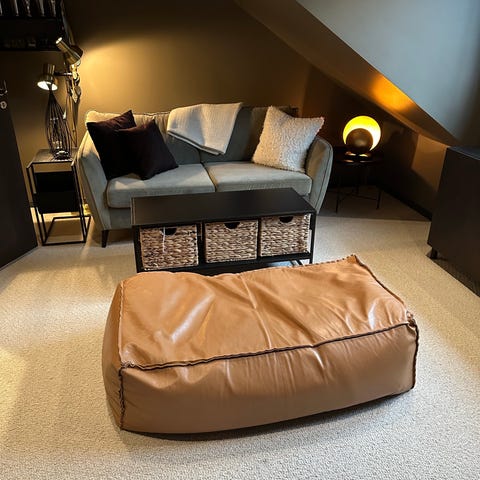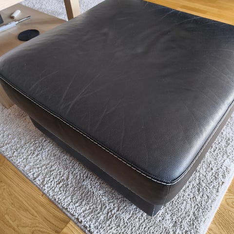 Brun puff i skinnmaterial. Möjlig att använda som sittplats eller fotstöd.