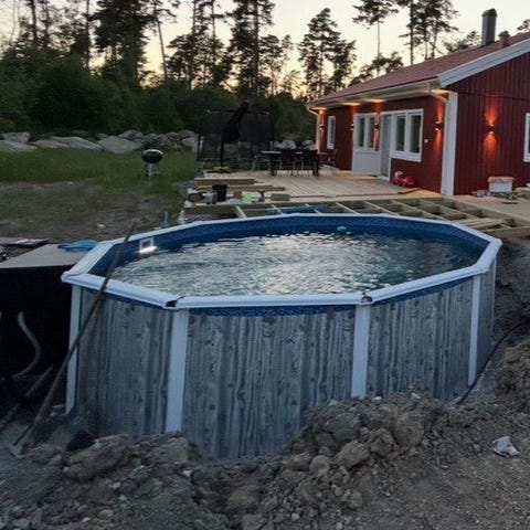Rörsystem med Ø 50 mm för ett ökat vattenflöde, förbättrad filtration och lättare att ansluta ett värmesystem. I poolpaketet ingår PVC slang, kulventil, vinklar och kopplingar som krävs för att bygga ihop poolen. Gjuten bottenplatta krävs samt stödmur längs långsidorna.