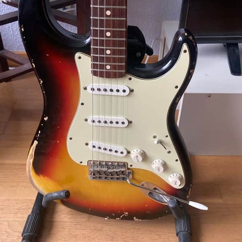 Fender Stratocaster Custom Shop Mary Kaye relicerad av Vince Cunetto-97, John Page era med största sannolikhet ihopplockat av John Cruz! Halsen utbytt till Fender CS relic -56 från-03 Magiskt resonant vibrerar i hela kroppen… Ombandad v.12 med Jescars ekvivalent till Dunlops 6105 ny bensadel och setup! Case centerpocket, coa , axelband, rätt pio(white/blue) svajarm… Fler bilder finns….
