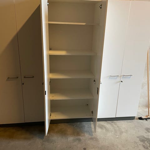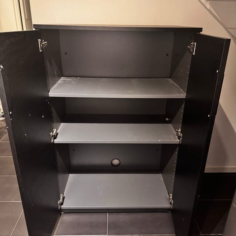 Snyggt och rymligt skåp med skjutdörrar från Kinnarps. Mörk grå stomme med ljus grå dörrar.
