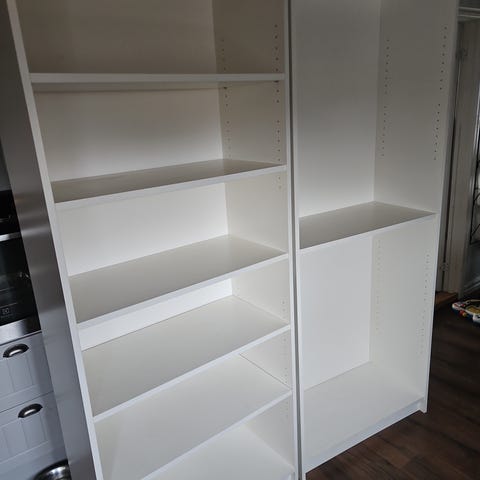 3 stycken billy bokhyllor med bra förvaring till olika ändamål. Finns slitage som exempel skruvhål då vi haft dem ihop skruvade finns även klössmärken främst på dörrarna då vi har katter 😼