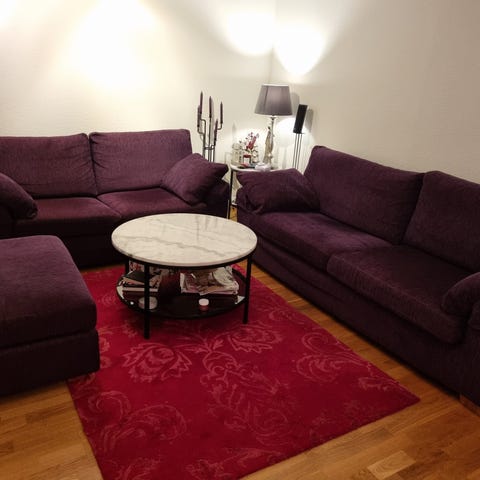 Soffgrupp Eden från Mio med 3-sits, 2-sits, fåtölj och fotpall. I mycket fint skick. Djur och rökfritt hem. Soffbord och matta medföljer om så önskas.