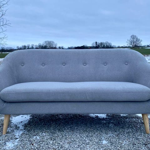 Jysk Egedal soffa i grått manchesterliknande tyg. Soffan har en rundad design med knappdetaljer på ryggstödet och svarta ben med metallspetsar.