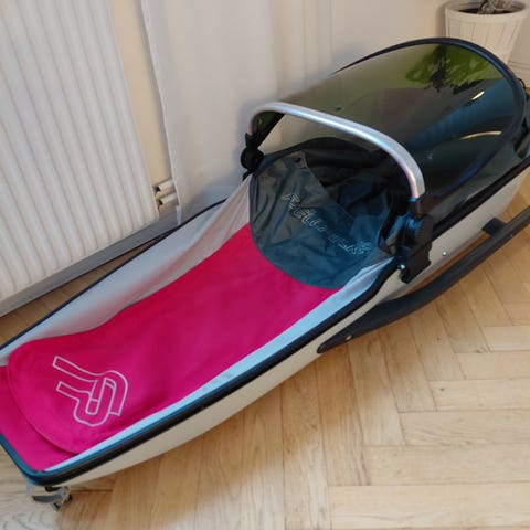Komplett pulka med sele, skaklar, tonad vindruta samt fodral. Varsamt använd, i mycket gott skick.