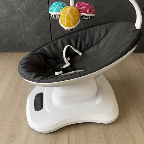 Babysitter i färgerna vit och grå. Babysittern har ett mjukt och vadderat säte med ett mönster i zigzag. Den är utrustad med en säkerhetssele och en leksaksbåge med två hängande mjukisdjur. Babysittern är avsedd för användning med spädbarn och småbarn.Gungar och spelar väldigt fin