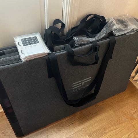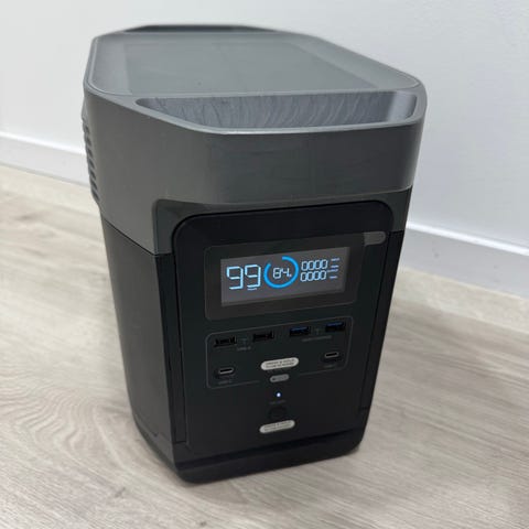 EcoFlow Power Station är en bärbar kraftstation i svart färg. Den har flera utgångar inklusive USB-A, USB-C, DC-utgångar och vanliga vägguttag, vilket gör den användbar för laddning av olika elektroniska enheter. Displayen visar batteristatus och annan relevant information