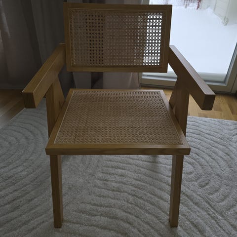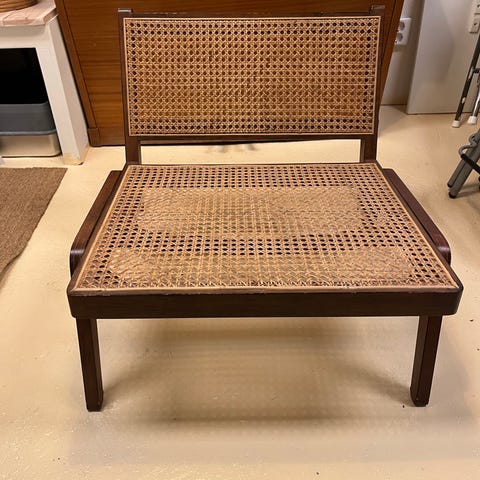 Tidlös och stilren loungestol i merantiträ med rottingsits och ryggstöd.