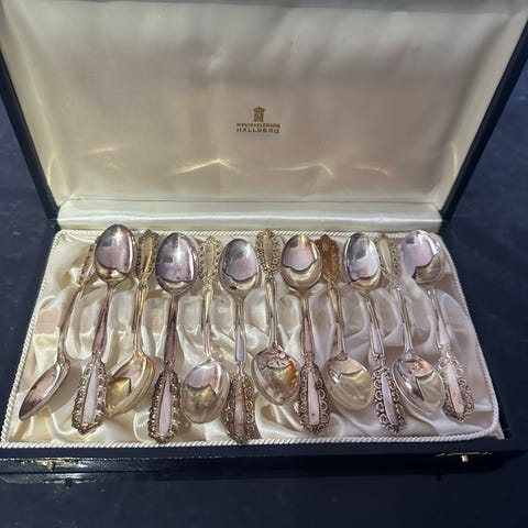 GEWE silver skedar set i en uppsättning med flera skedar i silver. Setet levereras i en fodrad förvaringsask med lila inredning. Skedarna är märkta med GEWE och norska silverstämplar.