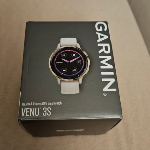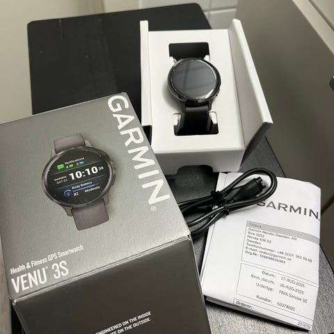 Garmin Venu 2 plus. En träningsklocka som är bra till alla tillfällen. Laddsladd medföljer. På bild två ser man i princip det enda slitaget klockan har. En liten repa högst upp på glaset. Nypris 4200