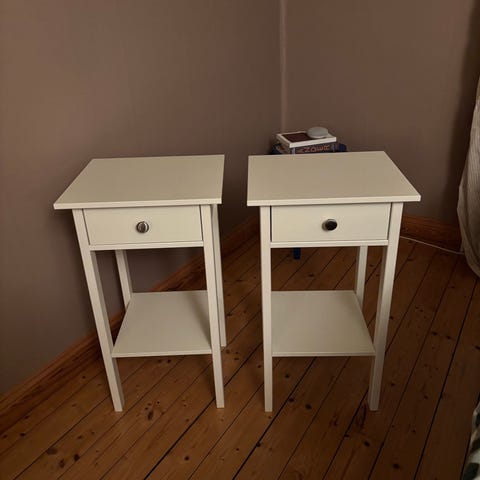 Två sängbord för vägg med hylla och låda, två år gamla. Nypris 750:- styck.