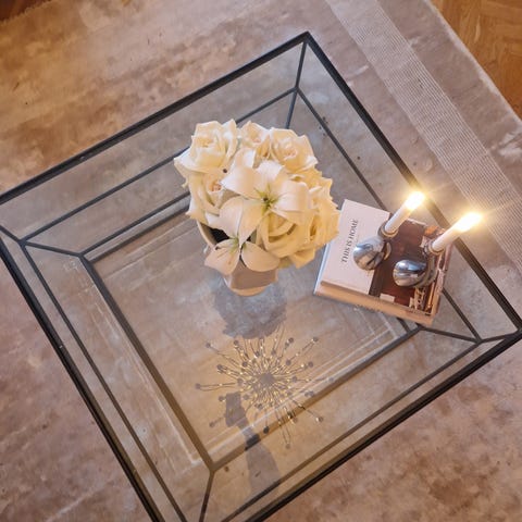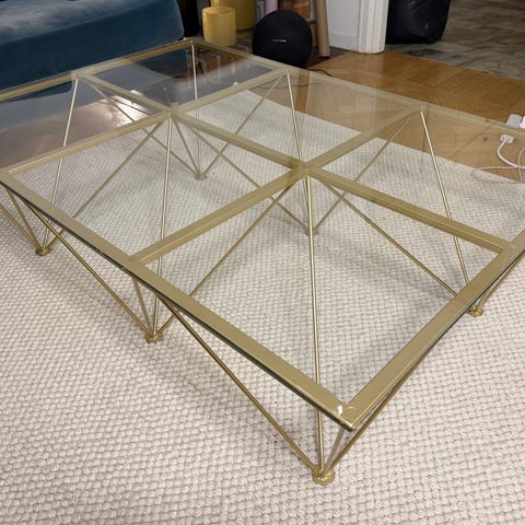 Säljer soffbord med.glasskiva och hyllplan i guldfärg.
